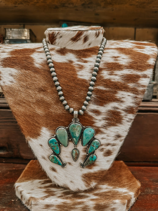 Genuine 8mm-24" Navajo Necklace W/ Cluster Turquoise Pendant