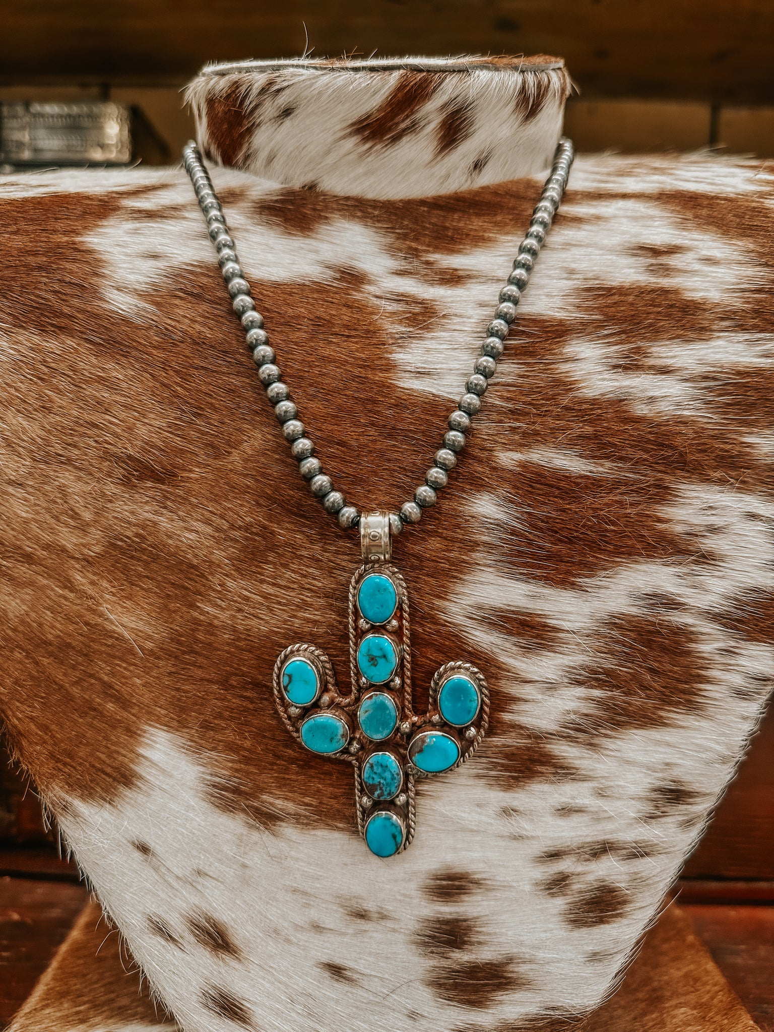 Genuine 5mm-20" Navajo Necklace W/ Turquoise Cactus Pendant