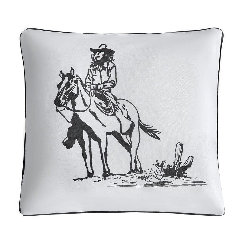 Add a playful Western charm to your bed, sofa, or porch with our Ranch Life Indoor/Outdoor Pillow. In a versatile black-and-white colorway, this pillow depicts a cowgirl on horseback treading through a desert. Black piped edges finish the look for a refined touch. Complement with our Ranch Life Quilt Set and coordinating pillows to complete a stylish and modern Western or Southwestern ensemble.
