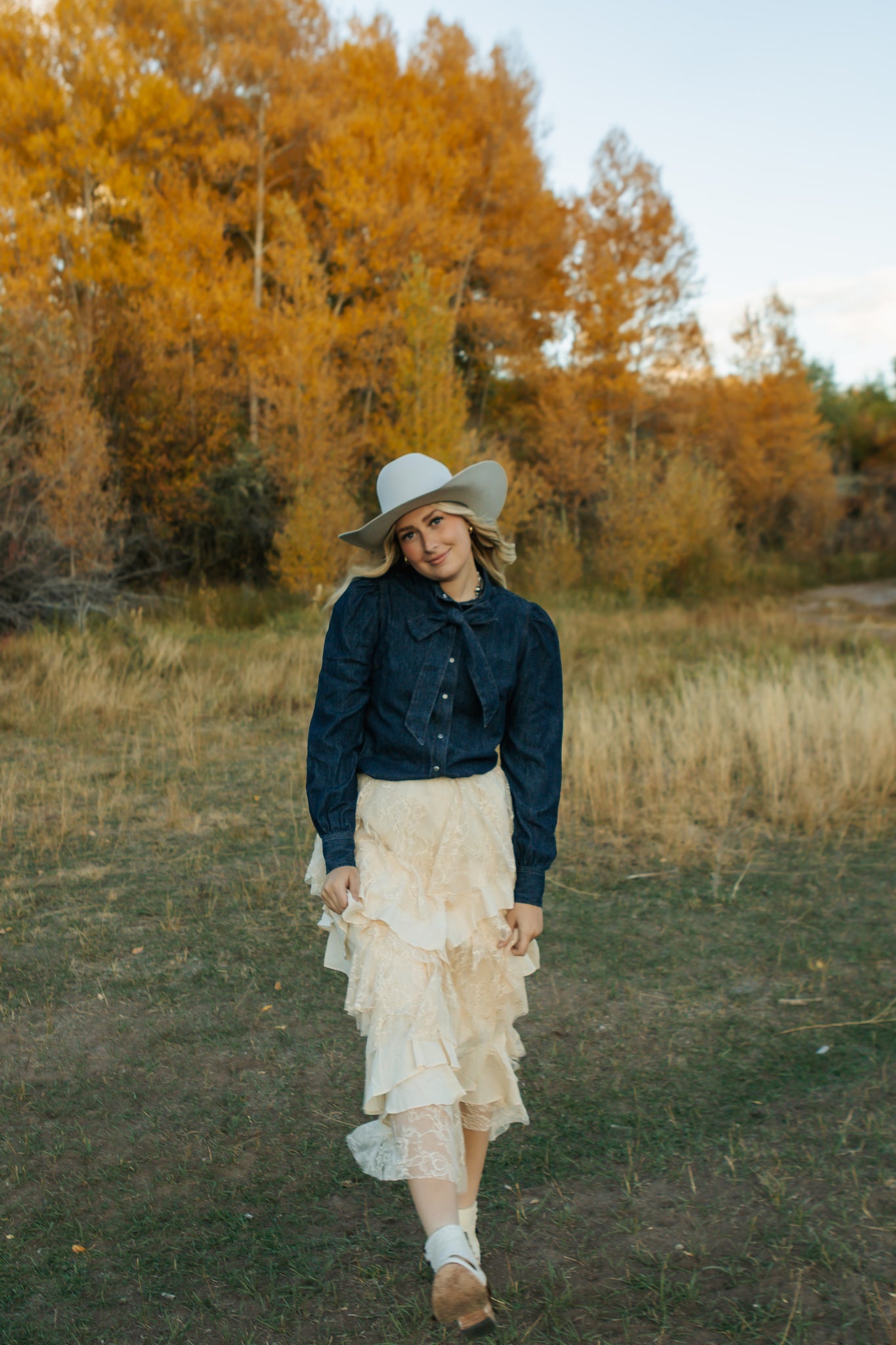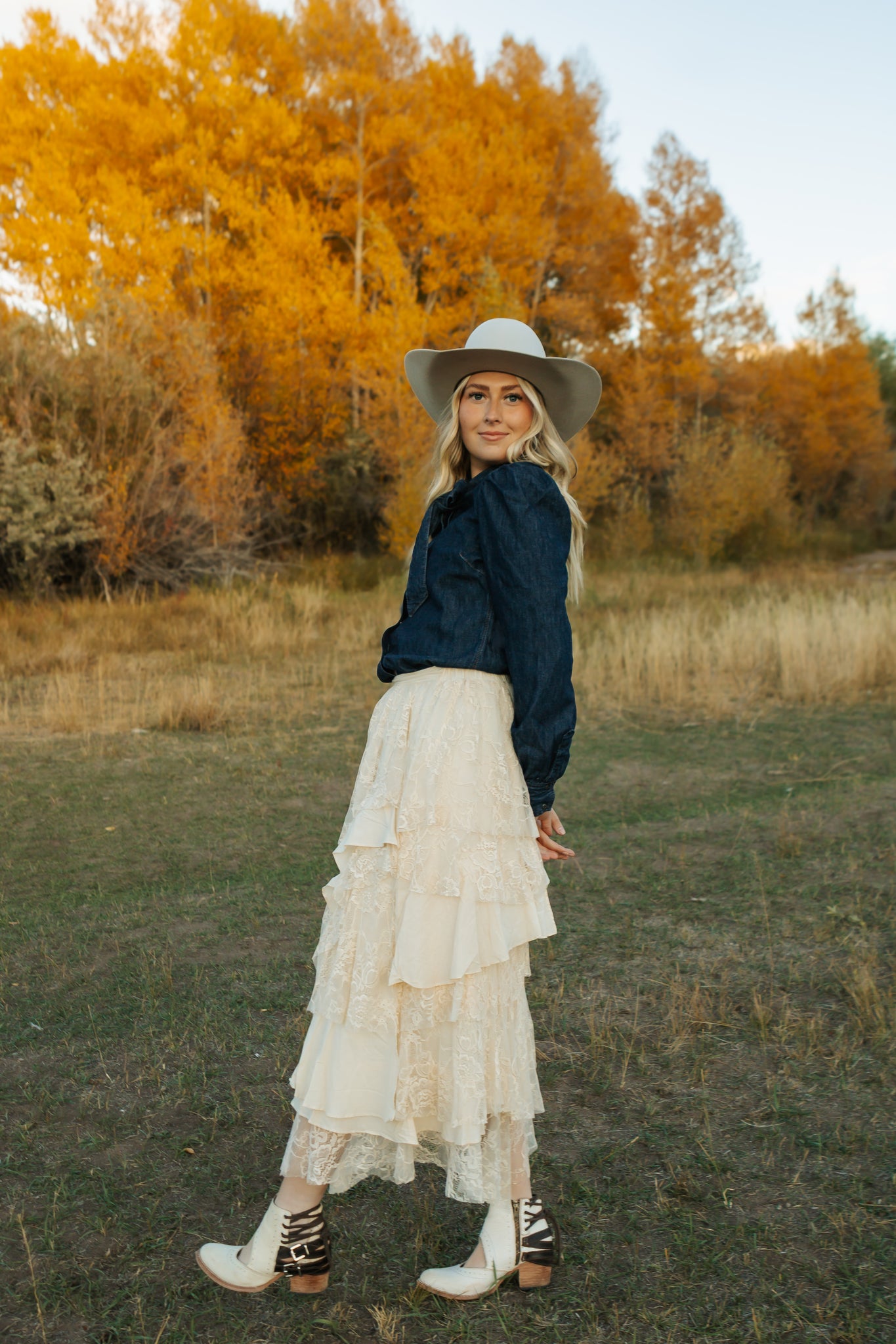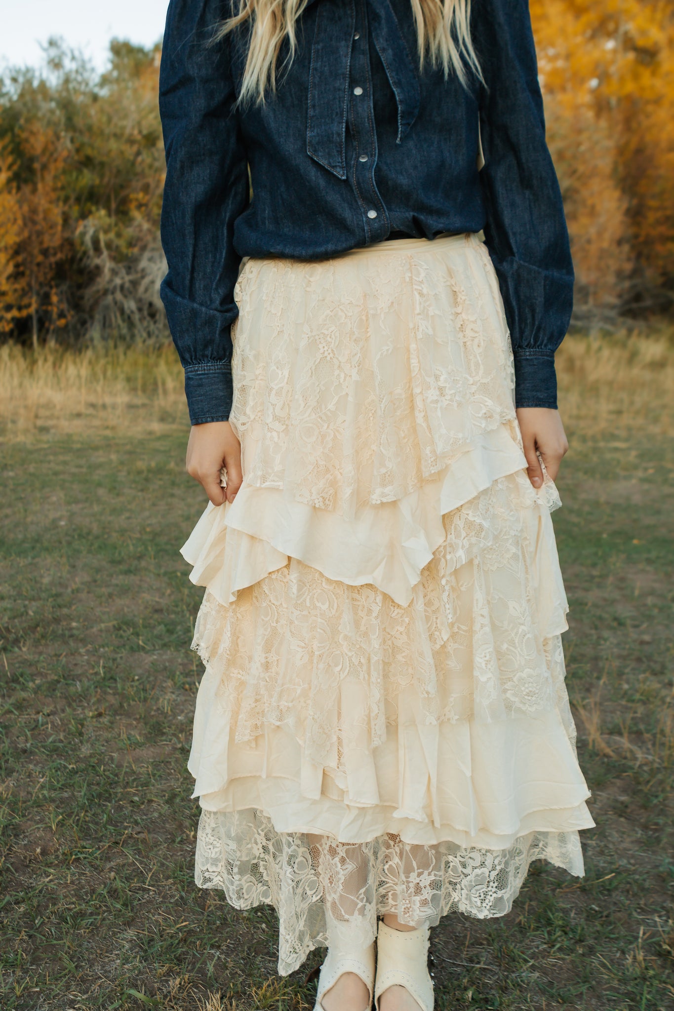Woven Cotton Tierred Ruffled Maxi Skirt With Cotton Lining, Lace Trim Detail And Back Waist Elasticband