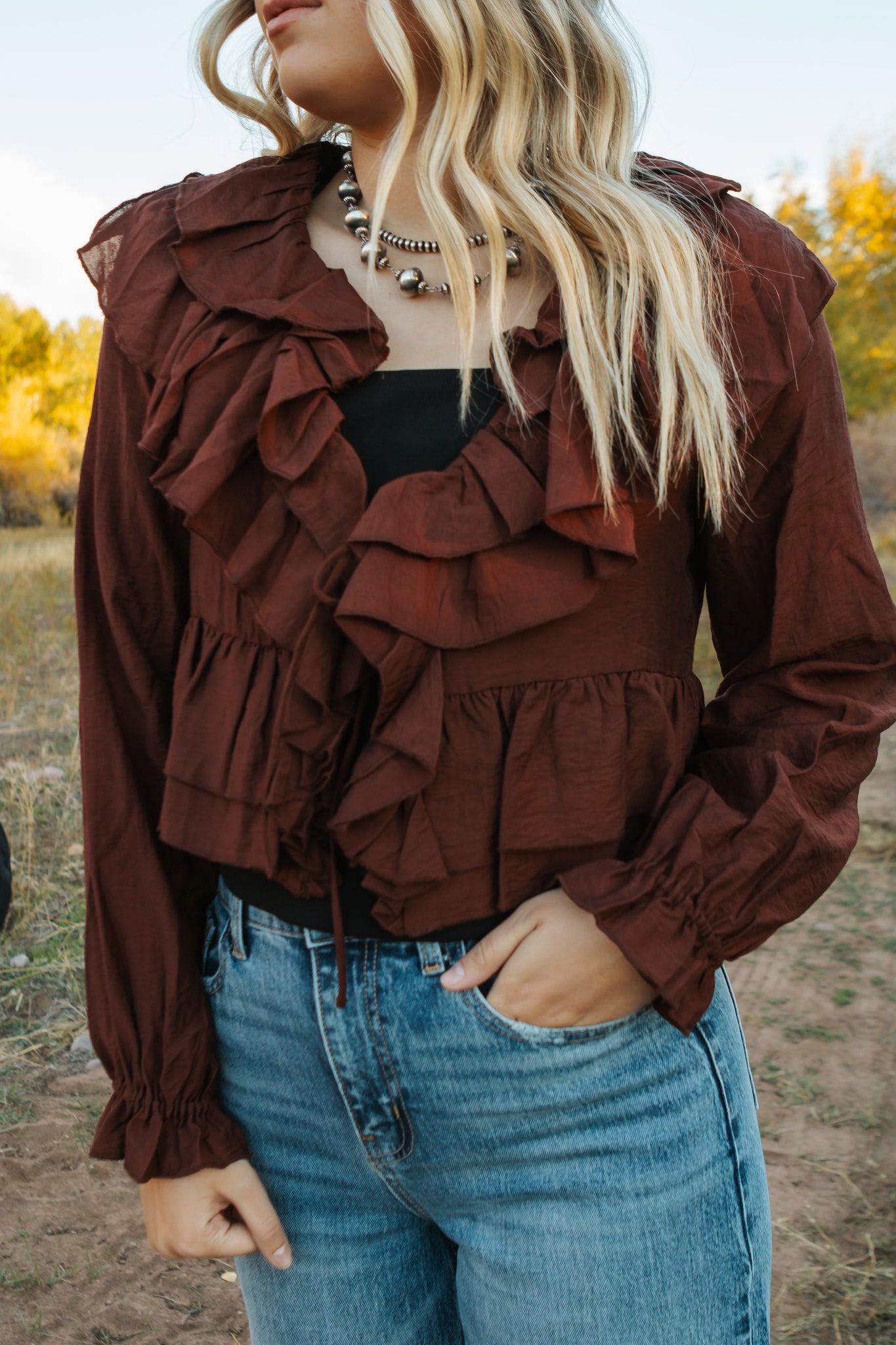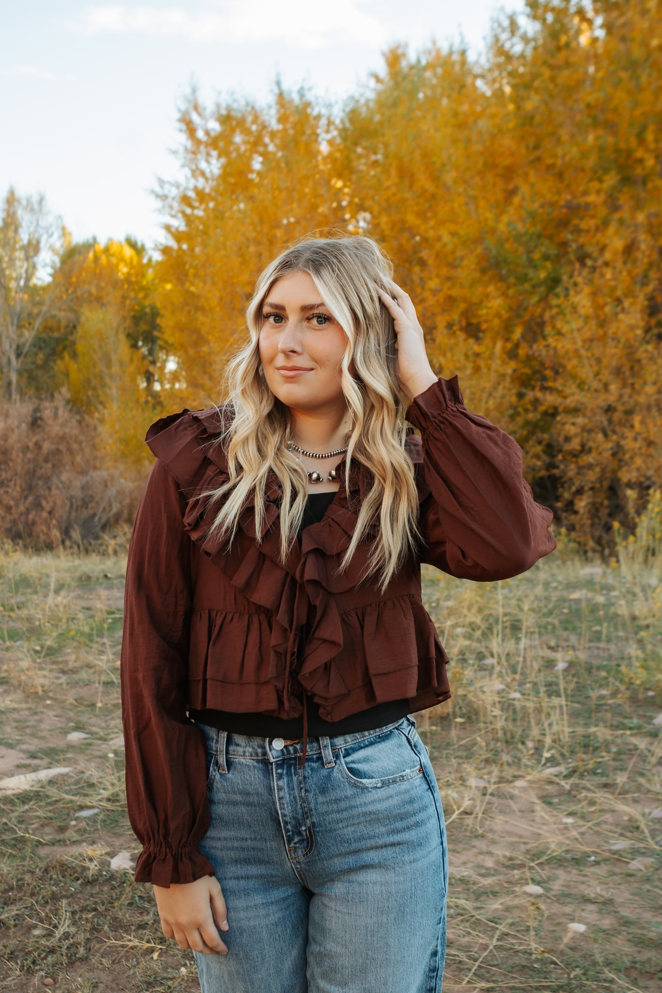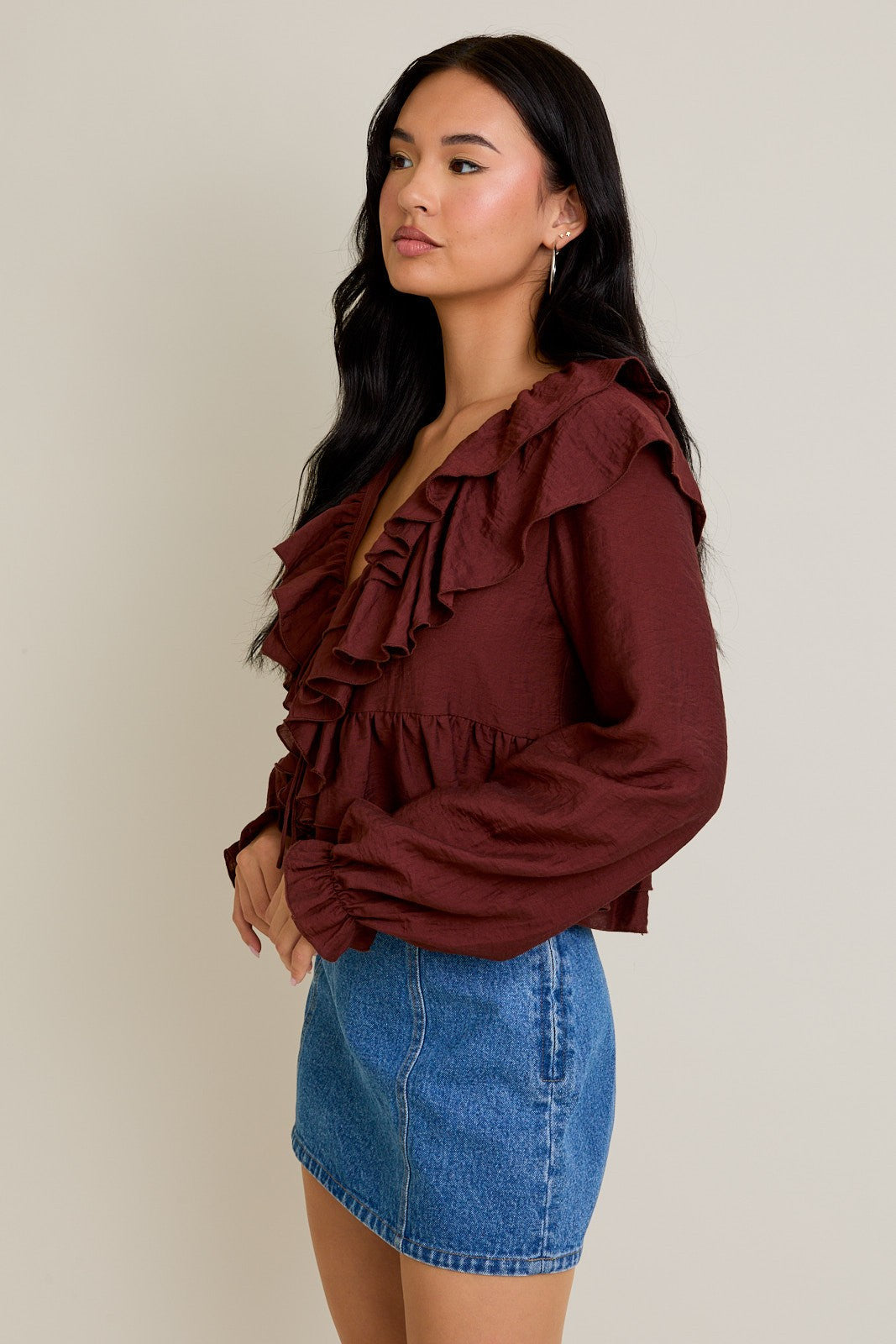 Long Sleeve V-neck Ruffle Detail Crop Blouse