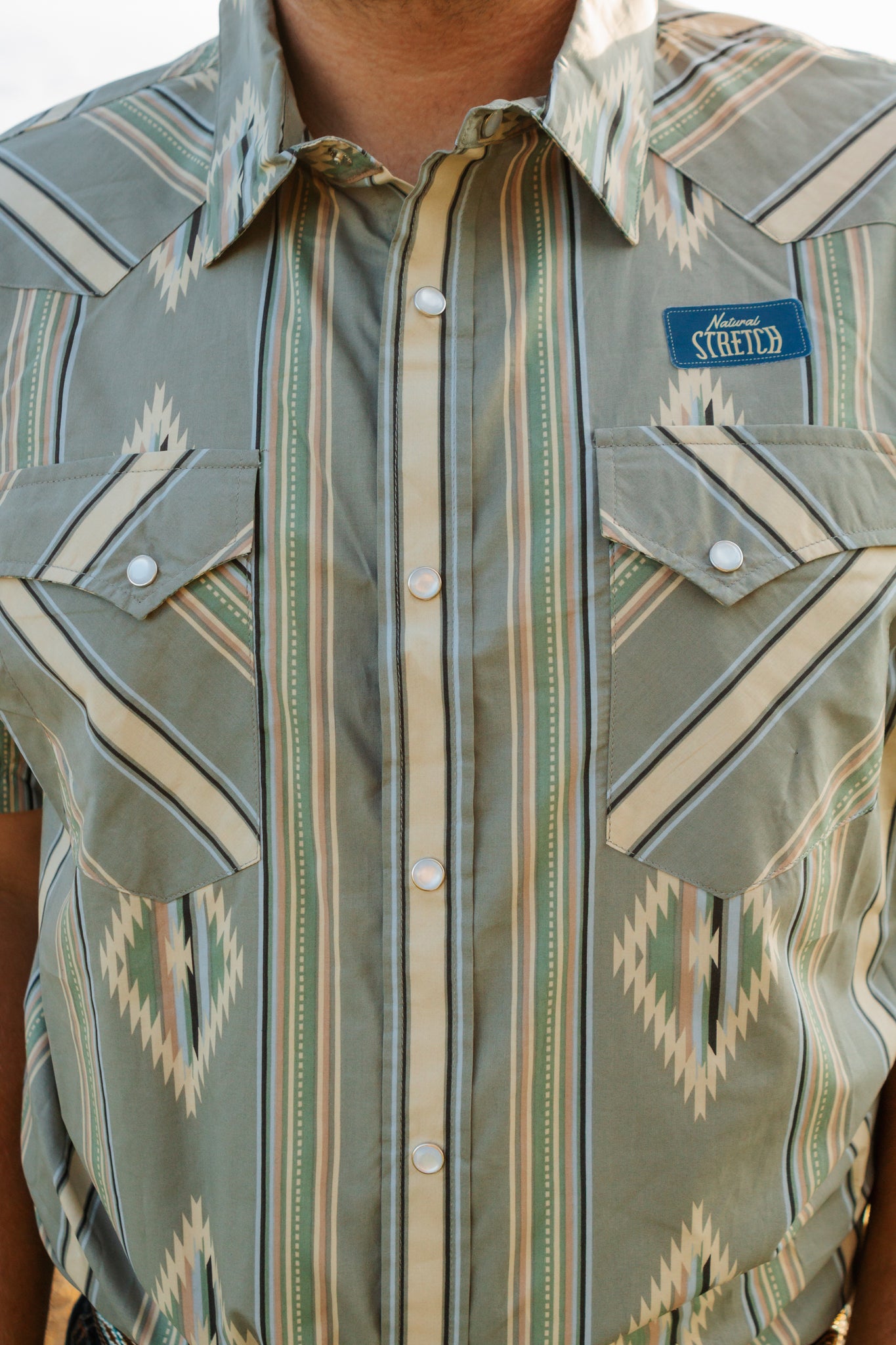 The Modern Vintage Aztec Stripes Short Sleeve Snap Shirt is a classic style with a modern twist. The Aztec stripes, alongside snap closures and chest pockets, offers an authentic style for the modern cowboy. Made from 100% cotton, this shirt is not only durable but will provide comfort all day long.