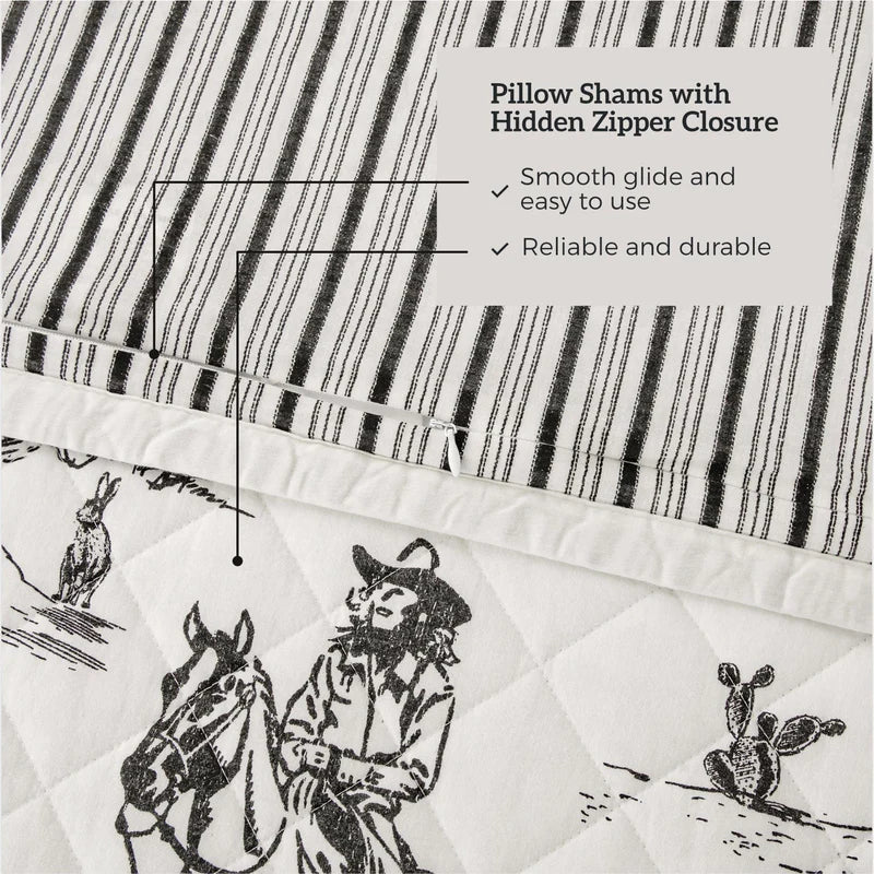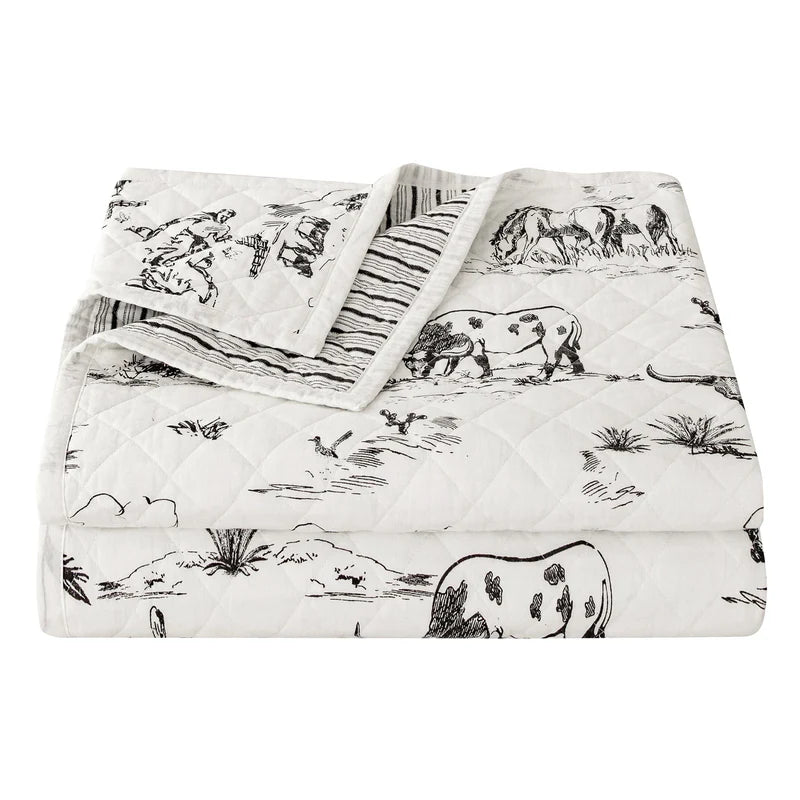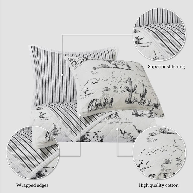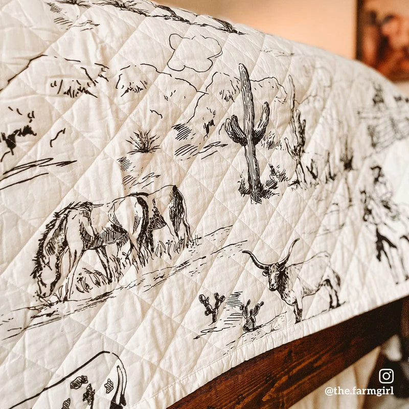 A playful Western take on traditional Toile de Jouy, our Ranch Life Western Toile Quilt Set takes you on a heritage journey through the American frontier, replete with natural scenery of wrangling cowboys, grazing cow herds, and frolicking desert wildlife. Its versatile black-and-white colorway lends a clean, modern look, juxtaposed with ticking stripes for a vintage feel. Suitable for both modern and traditional Western interiors, Ranch Life transforms into a rich rustic ensemble when mixed with the earth tones and rich textures of our Cotton Canvas Collection and faux leather pillows.